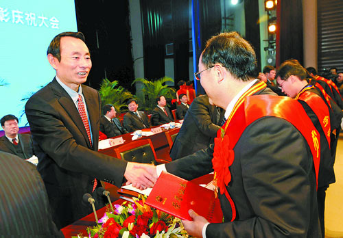 集團公司總經理蔣潔敏為長慶油田勞模代表和“感動長慶”典型代表頒獎。 記者 余海 攝