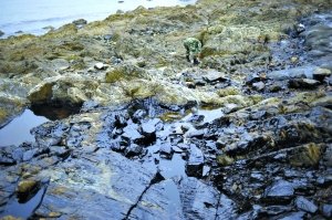 7月18日,退潮后岸邊的礁石上布滿油污。