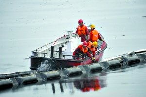 18日,在大連港事故現場的海面上,十多艘海事清污船正在作業。當天的清污工作主要由海事部門組織,大連軍分區派出1100名官兵、200名民兵參與清理。