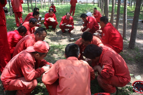 圖為每天的午餐只能在工地解決。岔71-2井附近有一片樹林,讓在野外施工的員工有一個