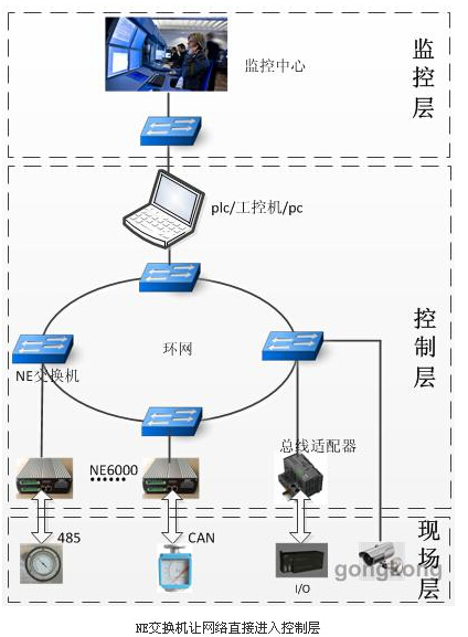 NE交換機支持多種總線協議及I/O接口,實現總線數據的網絡化。代替非傳統的點對點模式,使網絡和總線的資源利用率最大化。進而實現靈活的網絡配置,可直接連接儀表、工業相機等現場設備,讓PLC能夠連接到距離更遠的I/O設備,大大減少整個系統內PLC的數量,顯著的降低了系統集成的成本。此外NE交換機還可通過Web和SNMP OPC Server集成到網絡監控軟件實時監控節點狀態,并設有故障警報功能,方便遠程維護和管理。