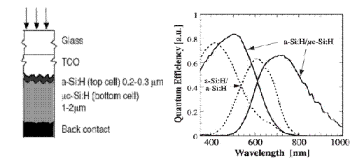 圖8 左圖:具有透明中間層的a-Si/mc-Si疊層電池的結構示意圖,右圖:有中間層與沒有中間層的a-Si/mc-Si疊層電池的量子效率對比