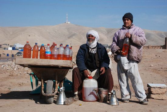 2011年1月,阿富汗Herat城郊區,一對父子在路邊用手推車做攤位,用食品飲料塑料桶盛石油制品來出售。