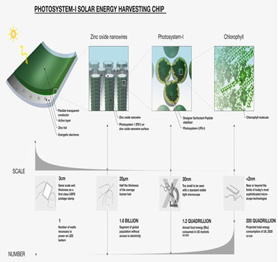 但是,要緊的事情要首先做。這里,麻省理工學院的安德烈亞斯.莫辛(Andreas Mershin)所做的非常有趣。他的化學雞尾酒是從植物物質中提取出光合作用分子,稱為光系統I(photosystem I),其中包括葉綠素(chlorophyll),還要使它們穩定,這樣,它們就可以涂在玻璃基板上。這種基板涂有納米線和二氧化鈦(titanium dioxide)“海綿”,有助于把光子轉換成電子,然后導出這些電子,形成電流。
