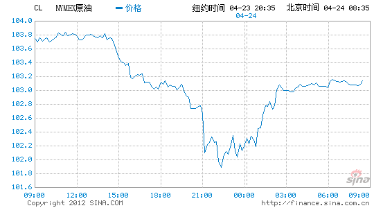 當日,紐約商業交易所(NYMEX)6月份交割的輕質原油期貨價格下跌77美分,報收于每桶103.31美元,跌幅為0.7%。