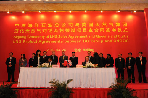 中國海油總經理傅成玉與英國天然氣集團首席執行官弗蘭克 查普曼當天在北京簽署了上述協議。英國約克公爵安德魯王子和澳大利亞聯邦資源及能源部長弗格森等前來北京出席簽字儀式。中方出席簽字儀式的有中國國家能源局副局長劉琦等。