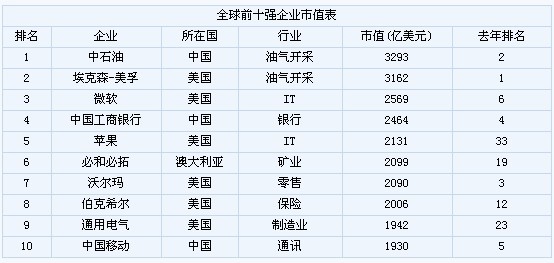 根據《金融時報》研究機構的報告,截至今年3月31日,中石油當前市值達到3293億美元,比第二名埃克森高出130多億美元。微軟名列第三,中國工商銀行則以2464億美元的市值緊隨其后。