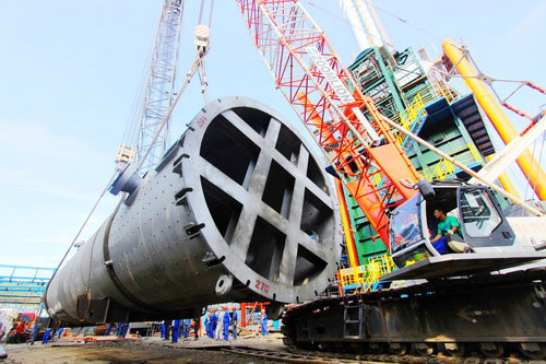 圖為柴油加氫裝置加氫反應(yīng)器的吊裝現(xiàn)場。 何天林 攝