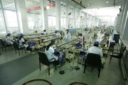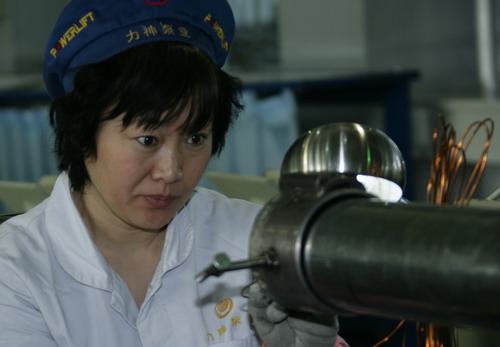 1力神員工專心致志組裝電泵定子。 |