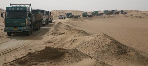 | 漫漫黃沙丘,運輸車輛克服困難,力保鉆井隊快速完成搬遷任務。 |