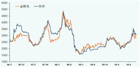 圖示華東甲醇現貨與倉單走勢對比圖,由此可見,倉單與港口聯動性較為明顯。一方面甲醇倉單和現貨行情中長期趨勢保持一致,另外倉單價格波動的幅度和頻度較現貨價格大;高低點的出現一般較現貨早。