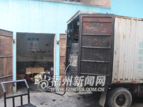 在知情人士指引下,下午3點多,記者來到工業路博美詩邦附近的一家大型修車廠。記者見到一輛金杯貨車停在一扇鐵門前,發出陣陣刺耳的機器轟鳴聲。記者走近一看,發現車廂后門敞開著,車內安裝了一個小發動機,正在高速運轉。車廂里放著幾個約1米高的油桶,表面滿是黑色的機油,散發出刺鼻的氣味,一根細長的皮管從油桶里延伸進一旁的小屋。兩男一女不時搬運一些設備,或爬上車查看油桶的情況。記者看見,這輛車牌號為閩AJ6051的貨車車門上,寫著臺江區一家五金店的名字。抽油半小時后,一男一女將小屋的鐵門鎖好便欲開車離開。