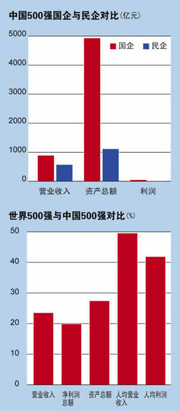 在這500家企業(yè)中,有310家國有企業(yè),其平均資產總額4937.8億元,是190家民營企業(yè)的4.4倍。南京大學商學院教授宋頌興昨日在接受《國際金融報》記者采訪時表示,500強榜單仍顯示了強烈的“國有特色”,“但對于中國經濟來說,最好的局面是民企和國企齊頭并進”,因此,“在未來的發(fā)展中,相關部門或仍需出臺一定的政策,從根本上幫助中國民企的進步”。