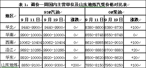 摘要: 發改委自9月11日零時起將汽、柴油價格每噸分別提高550元和540元,至今已有一周的時間。卓創數據監測,調價之后,國內各主營單位汽柴價格順勢上漲,據粗略統計,多數主營汽柴價格漲至新的批發限價。近期國際油價受美國發行第三輪量化寬松政策...