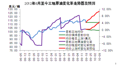 三地變化率預測:11日調價之后,三地變化率仍保持上漲走勢。但近兩日國際油價的大幅下跌使得變化率走勢出現震蕩。卓創數據粗略預算,如果三地均價每日漲幅至少在1美元/桶,則至10月9日(國際),即22個工作日滿足之時,三地均價持續漲幅將達15美元/桶的情況下,三地變化率會再次漲破4%。但如若國際油價保持震蕩走勢,22個工作期滿之時,三地變化率將難以達到±4%的條件。