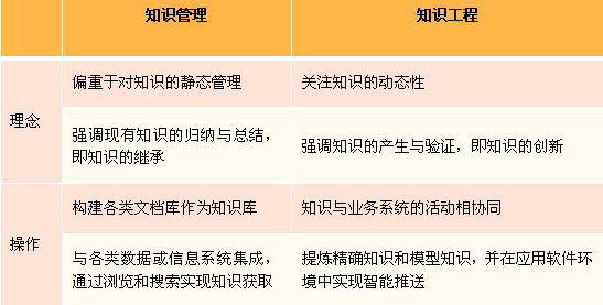對照知識管理的概念,可以定義知識工程(KE)為:在運營業務流程的過程中,獲取知識、創造知識、積累知識的活動。表1列出了KM與KE在理念和操作上的一些具體表現,我們可以更形象地理解什么是知識工程。