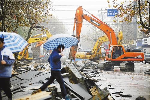 2013年11月24日,路人打傘經過中石化東黃輸油管道發生泄漏爆炸后被損路面。