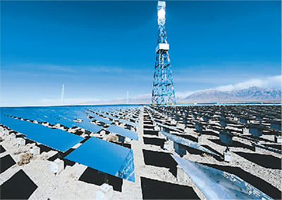 依托得天獨厚的太陽能資源和大面積的荒漠化土地,青海省加快推進柴達木盆地光伏發電產業的發展,3年間建成超過70座光伏發電項目,形成光伏裝機容量超過1600兆瓦。圖為德令哈塔式太陽能光熱發電站一角。