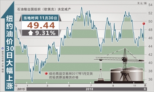 受歐佩克減產(chǎn)協(xié)議提振,國際原油市場出現(xiàn)了強勁反彈。截至當(dāng)天收盤,紐約商品交易所2017年1月交貨的輕質(zhì)原油期貨價格上漲4.21美元,收于每桶49.44美元,漲幅為9.31%。2017年1月交貨的倫敦布倫特原油期貨價格上漲4.09美元,收于每桶50.47美元,漲幅為8.82%。分析人士認(rèn)為,歐佩克減產(chǎn)的重要意義,除了實際減少產(chǎn)量之外,更重要的是歐佩克為國際原油市場明確了未來一段時間的走勢。