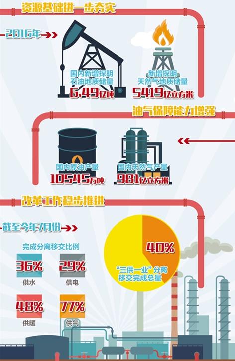 在混合所有制改革方面,中國石油出售中亞天然氣管道50%的股權,轉讓新疆呼圖壁等6座天然氣儲氣庫剩余天然氣儲量資產,中油工程和中油資本重組成功上市;在治理結構改革方面,擴大經營自主權試點,有序剝離非主營業務,減虧增盈效果顯著……