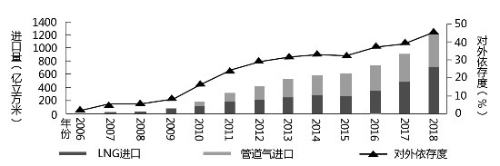 中國天然氣進口量及對外依存度變化(來源:2018年國內外油氣行業發展報告)